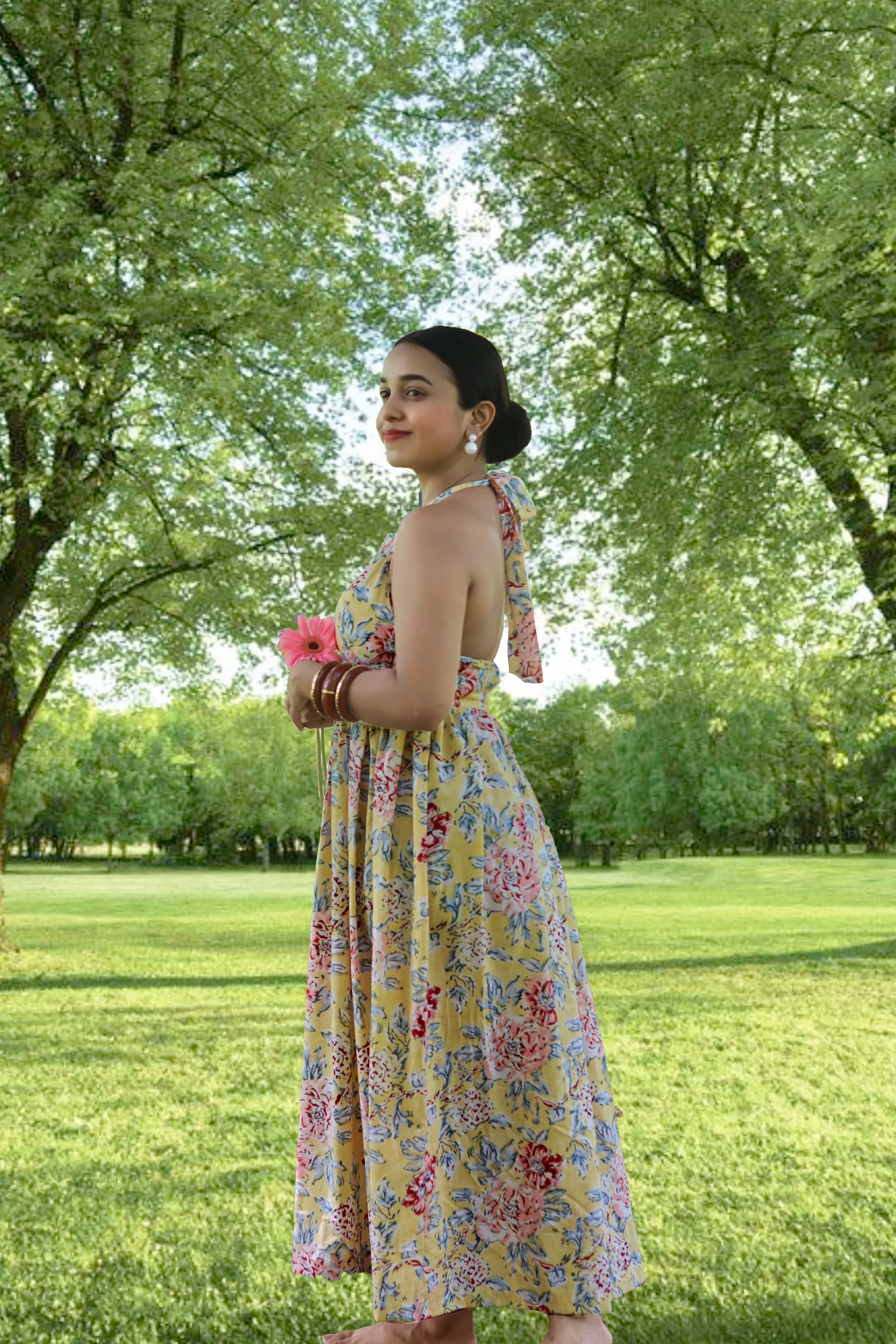 Floral Halter Neck Maxi Dress A breezy halter-neck maxi designed to feel like sunshine on your skin. This dress ties at the back for an adjustable fit and features gentle waist gathers that fall into a relaxed, flowy silhouette. Deep, functional pockets bring ease to everyday styling without compromising elegance. Perfect for brunches, summer getaways, garden picnics, or slow evening strolls. Dress it up with pearls and sandals, or keep it effortless with flats and soft hair buns. Why you’ll love it: Because comfort shouldn’t cancel beauty. This piece is light, breathable, flattering on all body shapes, and crafted for days when you want to look effortlessly put-together without trying too hard.