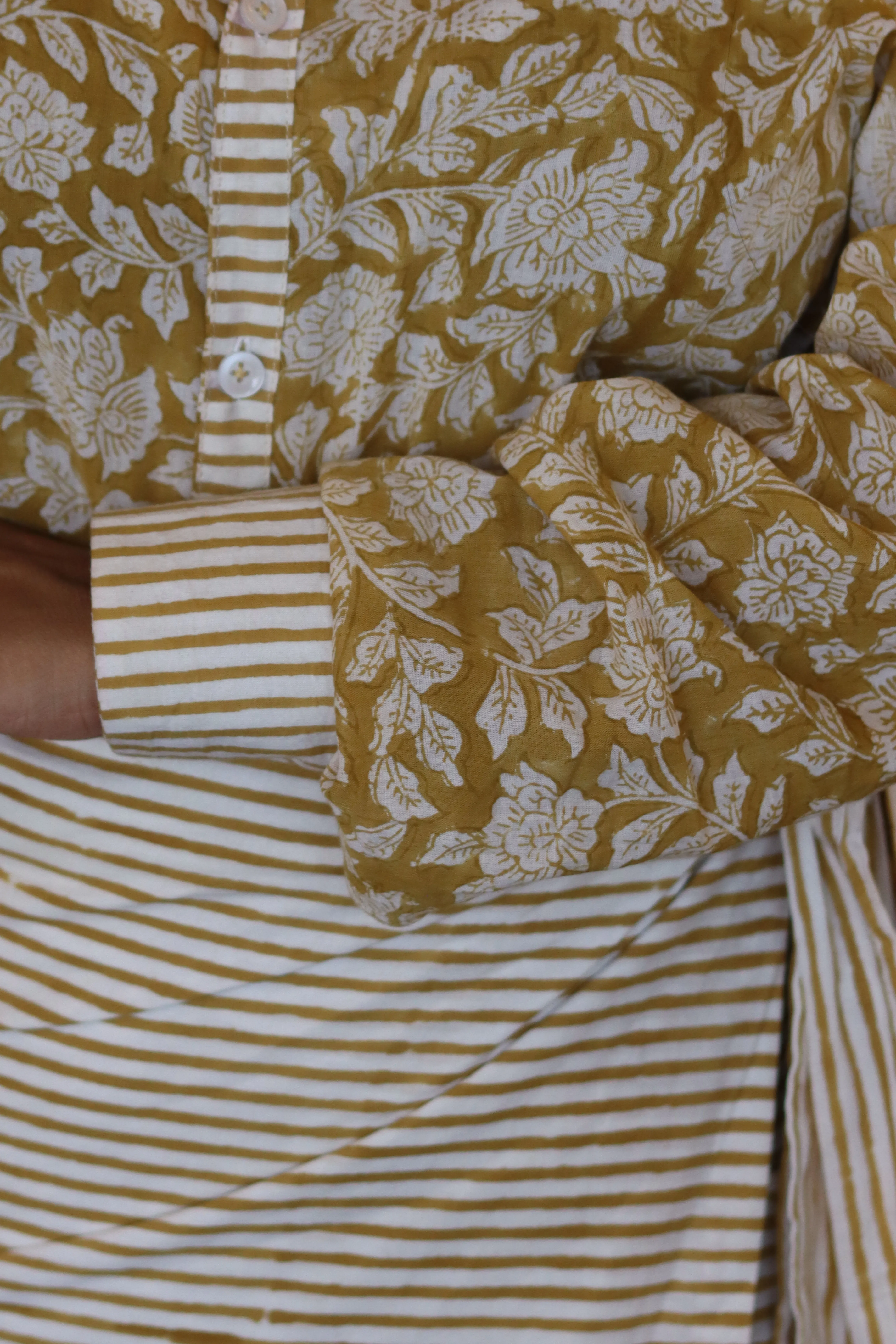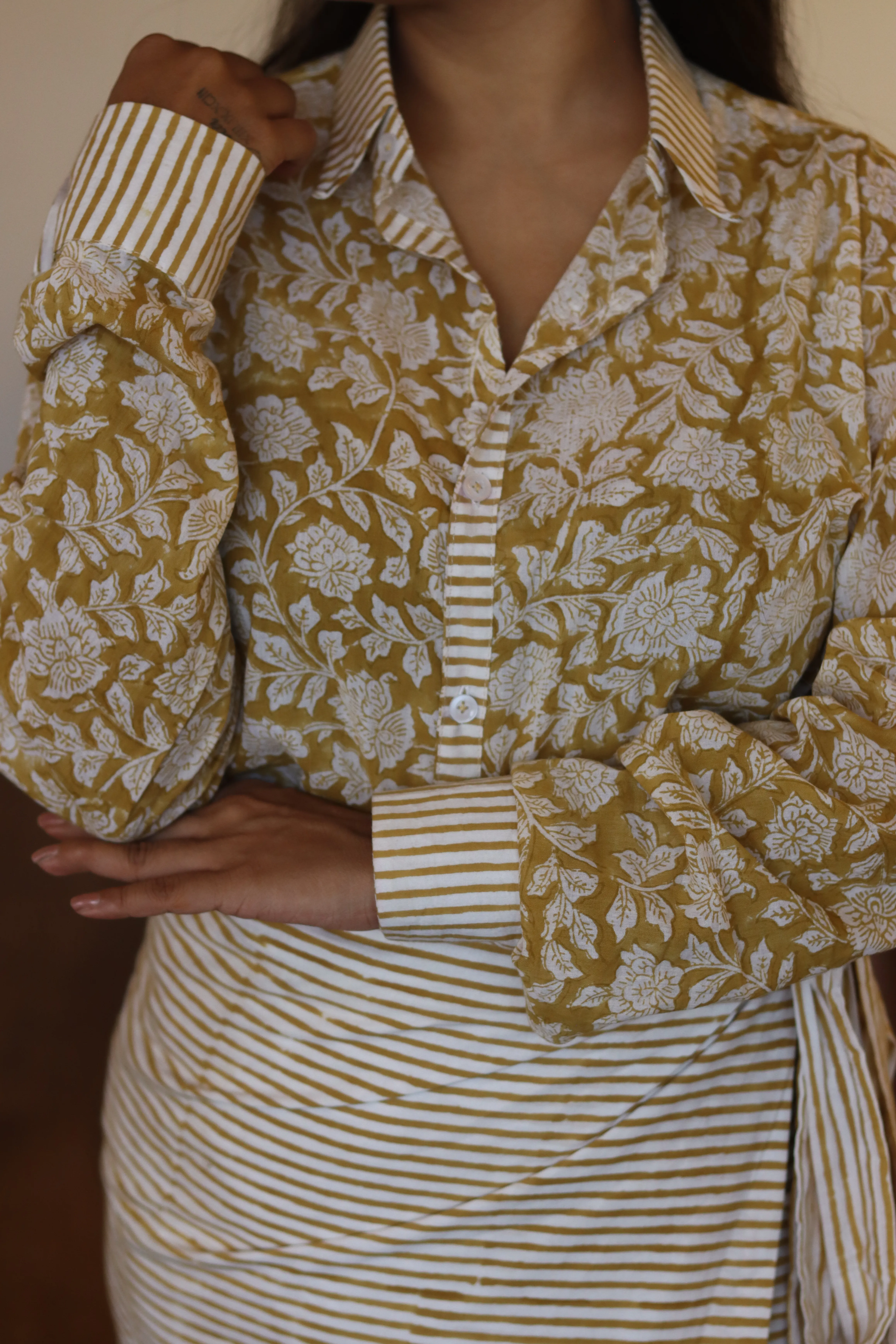 Meet Zyrah mustard shirt set , The shirt is made in a light, breathable hand-block print , the kind that sits gently on the skin and never feels fussy. It has small, delicate motifs that instantly add a little elegance, even on the days you’re running out the door with zero time to think. The wrap mini skirt is where all the fun begins and it ties beautifully, falls just right, and moves with you. The print is a mix of little patterns and soft blue tones that balance the whole look, giving it a youthful, breezy vibe.