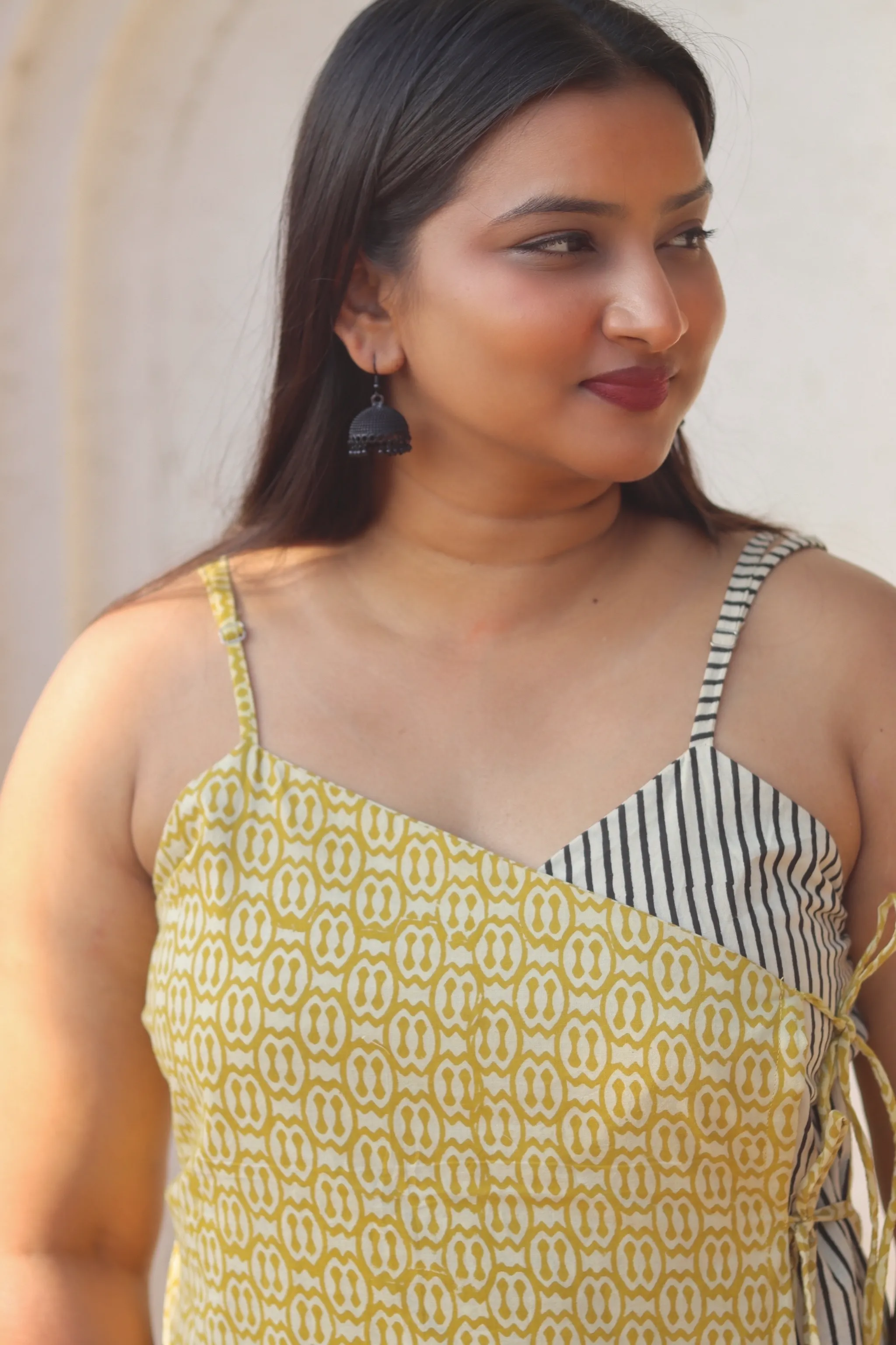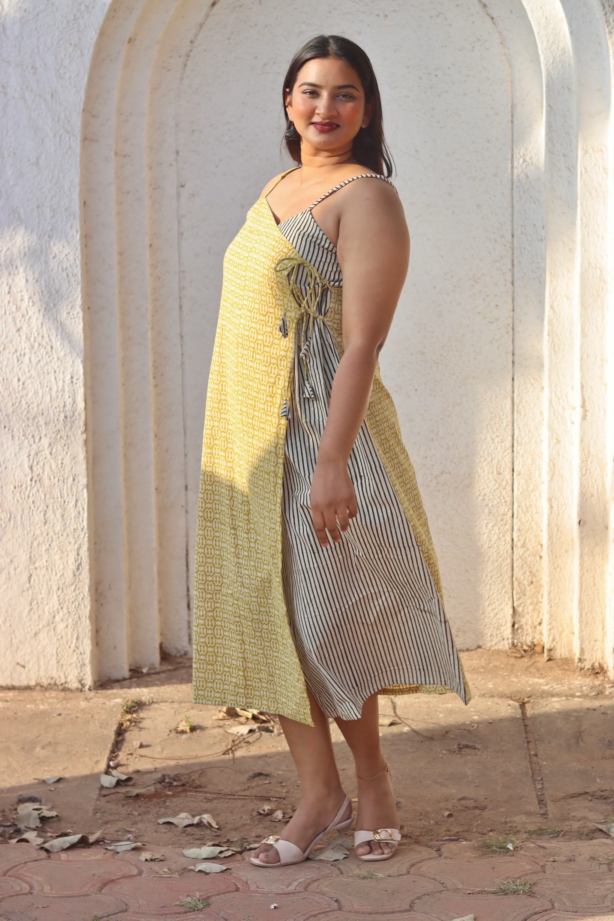 This wrap-style midi dress is dual-print concept, where each side showcases a different print one side in a soft geometric hand block-inspired motif and the other in classic vertical stripes. It is Designed with a side wrap closure, the dress is secured using a fabric dori tie-up allowing you to adjust the fit comfortably around the waist. The wrap construction not only enhances ease but also flatters the body by creating a natural silhouette. The dress comes with adjustable shoulder straps, making it easy to customise the length and fit according to your comfort. Crafted in breathable fabric, it moves effortlessly with the body and feels light on the skin perfect for warm days.